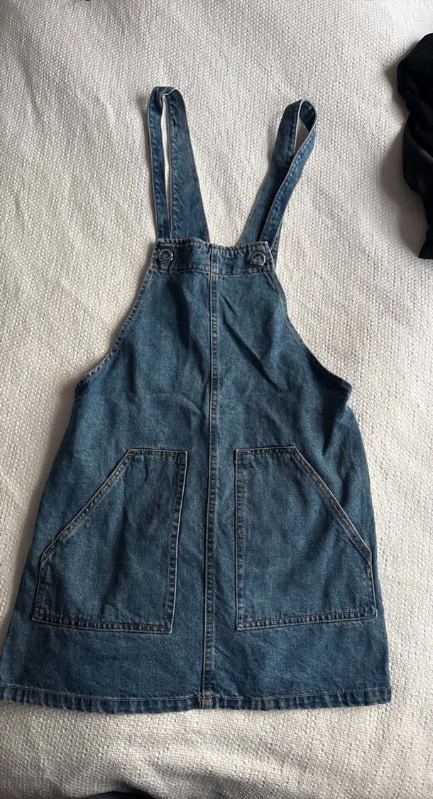 Mavi kot midi askılı tulum, bol kesim ve askısız yaka ile. Tokalı askılar ve büyük ön cepler içerir. Günlük rahat sokak stili için uygundur.