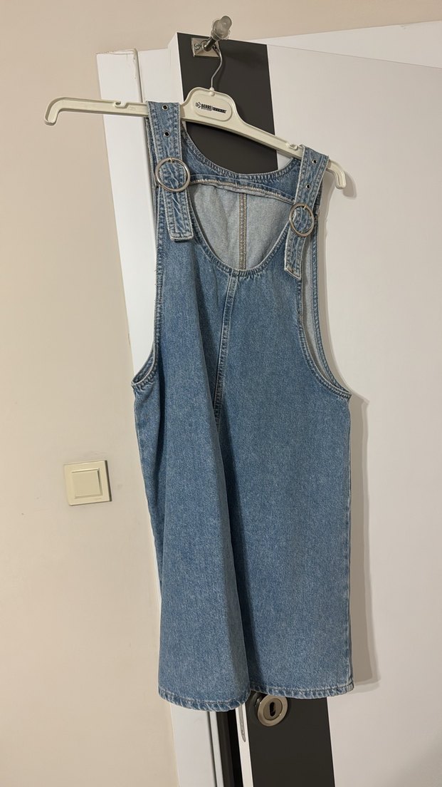 Bol kesim, kot kumaştan, tokalı askılı, kolsuz ve straplez yaka midi tulum, günlük rahat kullanıma uygun.