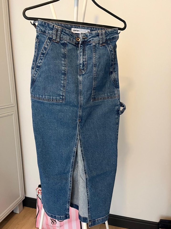 Bel kemerli, önden yırtmaçlı, dar kesim mavi kot midi etek. Günlük ve rahat sokak tarzı için uygundur.