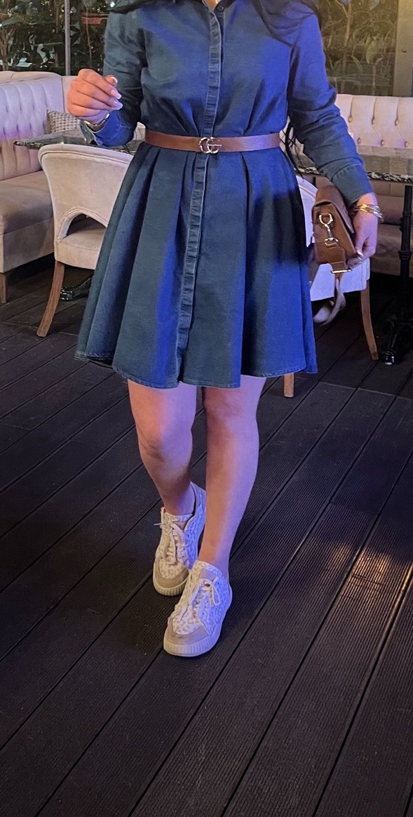 Mavi kot kumaştan, bol kesim ve kemer detaylı midi etek. Günlük kullanım ve sokak stiline uygun, desensiz ve açık renk.