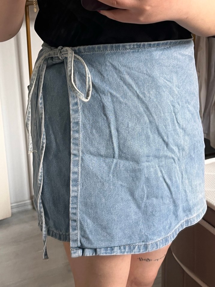 Kadınlar için kemerli, midi boy, bol kesim mavi kot şort. Günlük rahat kullanım için uygundur.