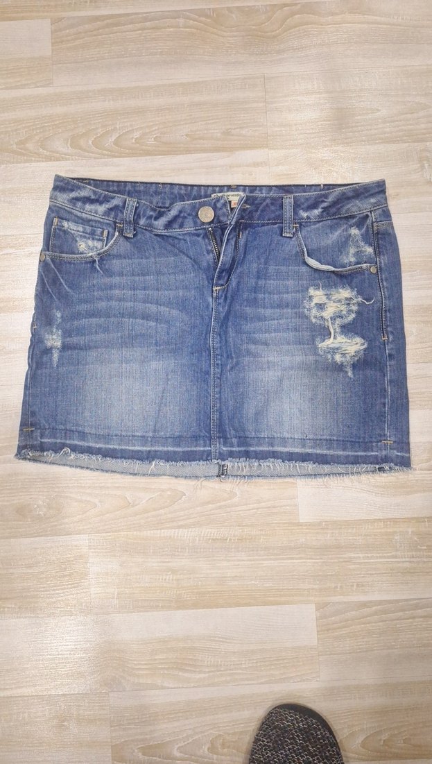 Kadınlar için mavi kot mini etek, yıpranmış detaylara ve kemerli bele sahiptir. Rahat kesimi ve günlük stiliyle normal uzunlukta, trendy görünüm sunar.