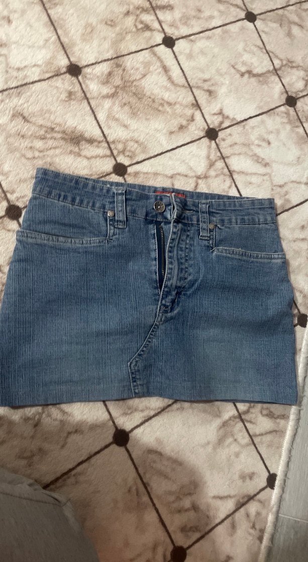 Fitted kesim mavi kot mini etek, kemerli ve normal uzunlukta. Günlük sokak stili için uygun rahat tasarım.