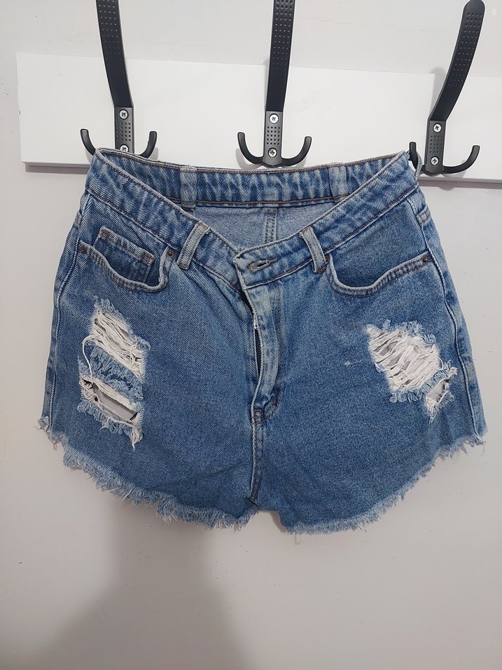 Mavi kot mini şort, bol kesim ve kemerli tasarıma sahip. Yırtık detaylar ve rahat sokak stili ile günlük kullanıma uygun.