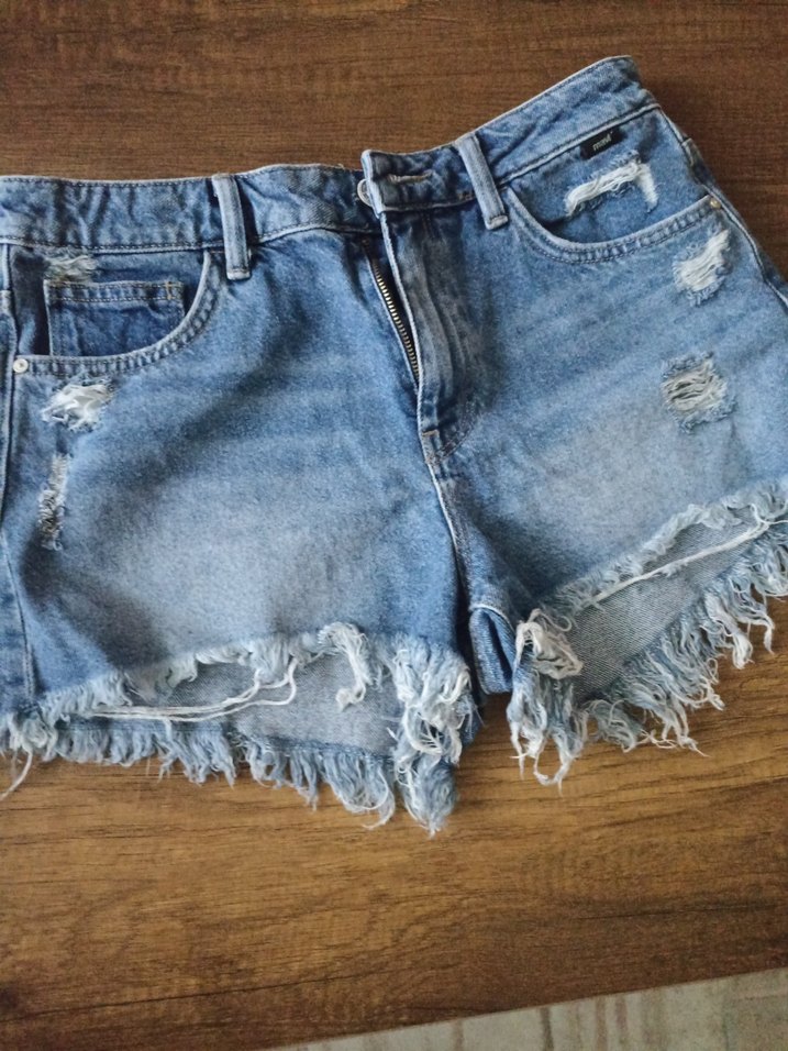 Bol kesim mavi kot mini şort, tokalı ve yırtık detaylı, günlük kullanıma uygun rahat bir stil sunar.