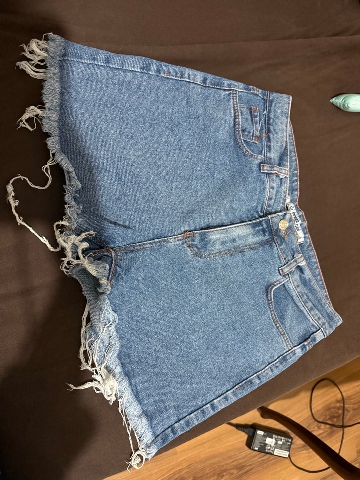 Gevşek kesim, tokalı detaylı ve püsküllü kenarları olan mavi kot mini şort, gündelik kullanıma uygundur. 38beden