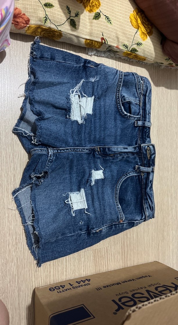 Kadınlar için bol kesim, kısa paça kot şort. Yırtık detayları ve kemer tokası ile günlük sokak stili için uygundur.