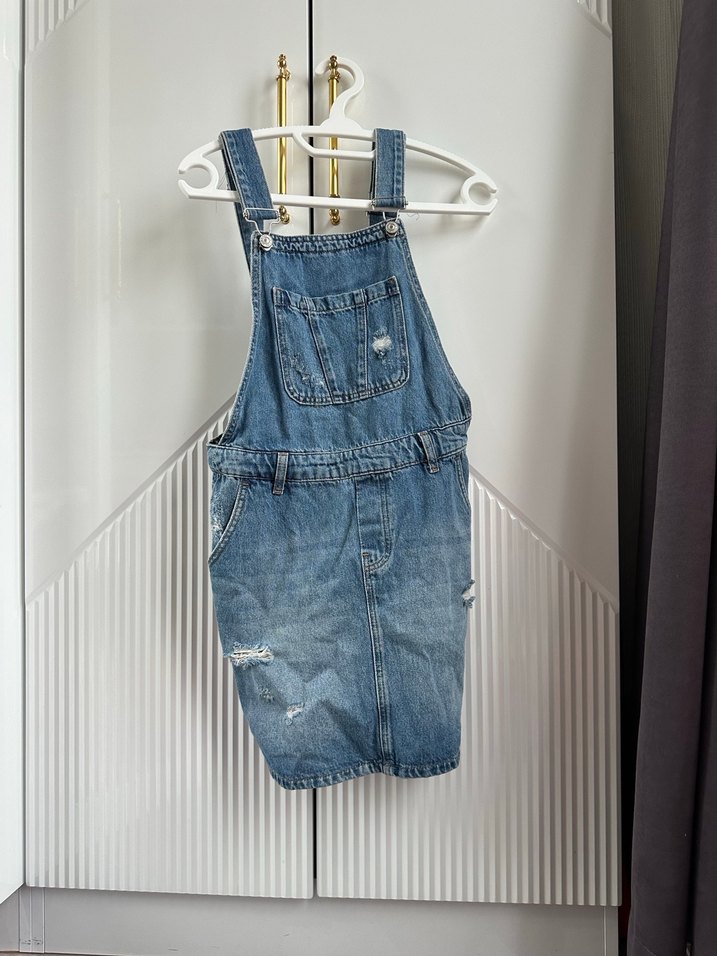 Ayarlanabilir tokalı askıları, bol kesimi ve ön cep detayıyla mavi kot mini tulum, rahat sokak stili için uygun.