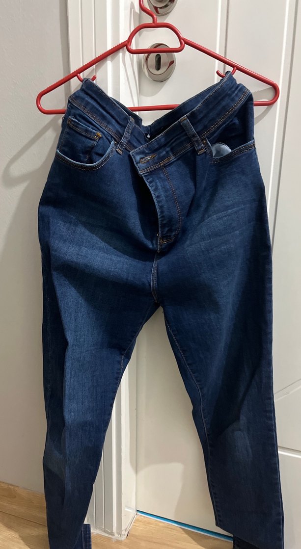 , düz mavi renkli kadın kot pantolon, gündelik kullanıma uygun, vücuda oturan kesimde.