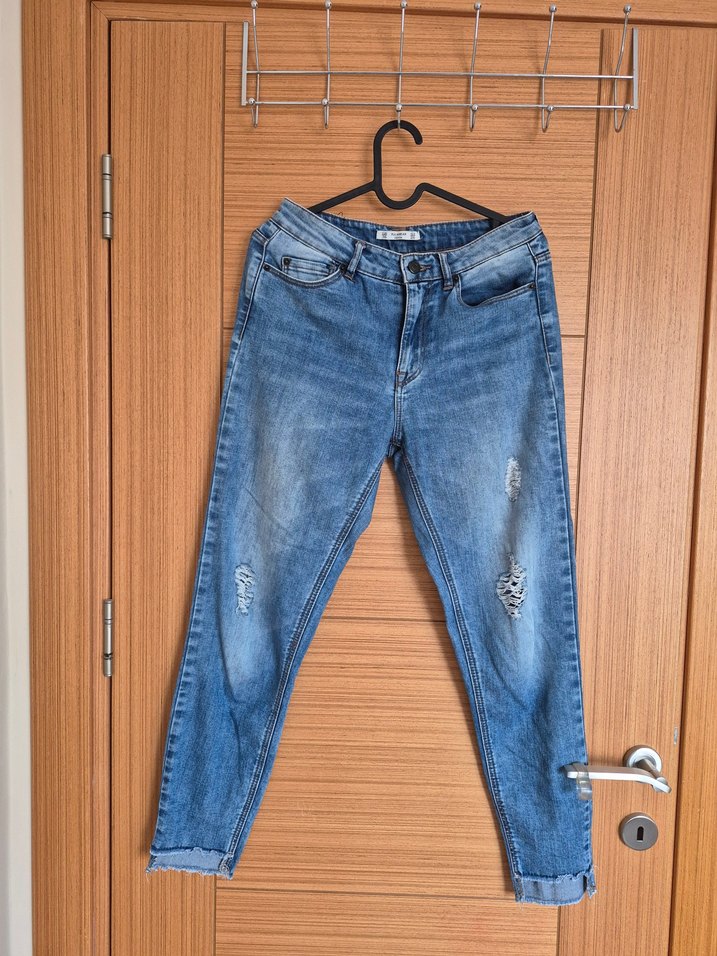 Kadınlar için kot kumaştan yapılmış, tokalı detaylı kot pantolon. mavimsi renkte, gündelik kullanıma uygun normcore tarzda. pullbear marka 36 beden .