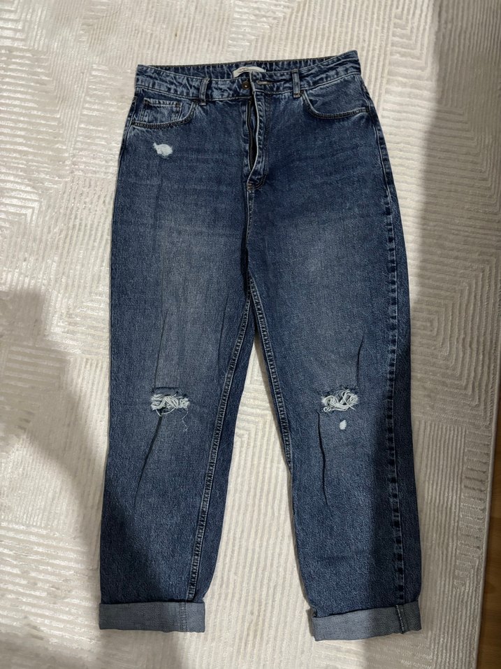Mavi denim kumaştan, bol kesim ve midi boy kadın kot pantolon. Tokalı bel ve hafif yırtık detaylara sahip. Günlük rahat sokak stili için uygundur.