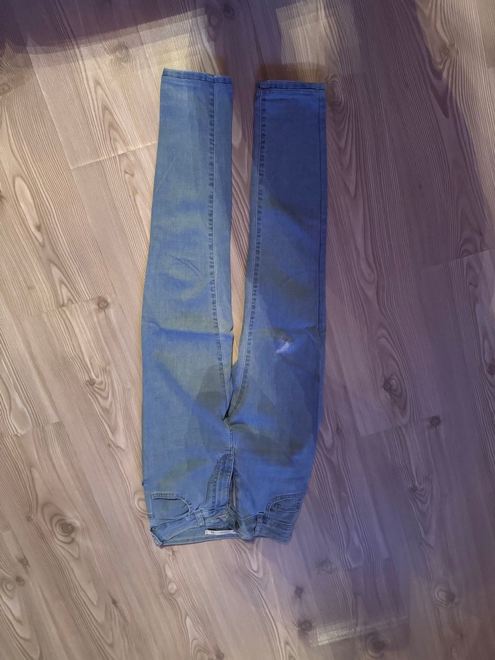Dar kesim, kemerli, mavi denim kadın kot pantolon. Midi boyda, desen içermeyen, günlük rahat kullanıma uygun.
