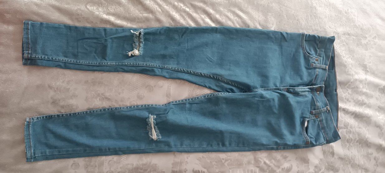 Kadınlar için kemerli, midi boy ve dar kesim kot pantolon. Mavi ve gri tonlarında, desen içermeyen günlük normcore tarzında kot pantolon.