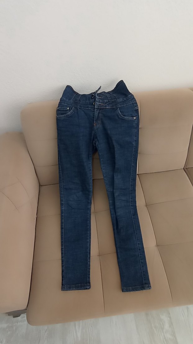 Kemer detaylı ve midi boyda, mavi kot kumaştan yapılmış, dar kesim kadın pantolon. Günlük sokak tarzı için uygundur.