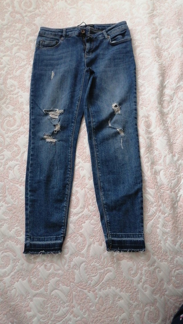 Mavi renkli, yırtık detaylı, tokalı, rahat kesim kadın kot pantolon. Normal boyda, günlük kullanıma uygun.