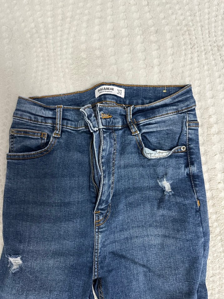 Tokalı, midi boy, fitted kesim mavi kot pantolon, günlük kullanıma uygun normcore tarzda.