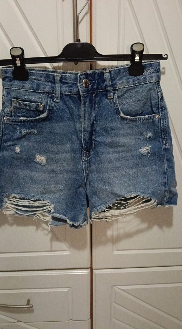 Bol kesim, kemerli mavi kot şort. Kısa boyda, yırtık detaylı ve gündelik kullanıma uygun.