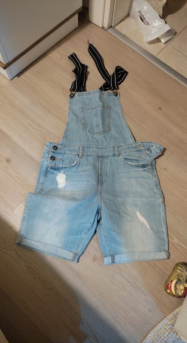 Bol kesim mavi kot şort salopet, tokalı ve siyah beyaz çizgili askılı. Ön cep ve yıpratma detayları var. Günlük sokak stili için uygun.