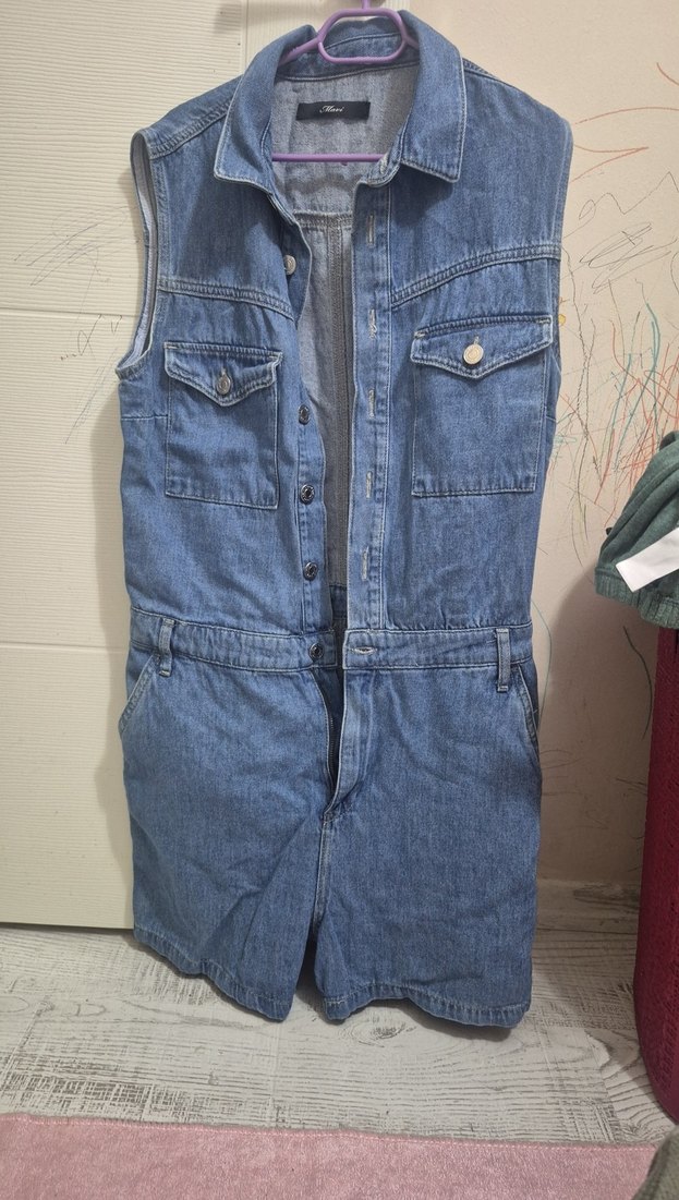 Kolsuz, mavi kot tulum. Notch yaka ve kemer detaylı, düğmeli, rahat kesim. Günlük sokak stili için uygundur.