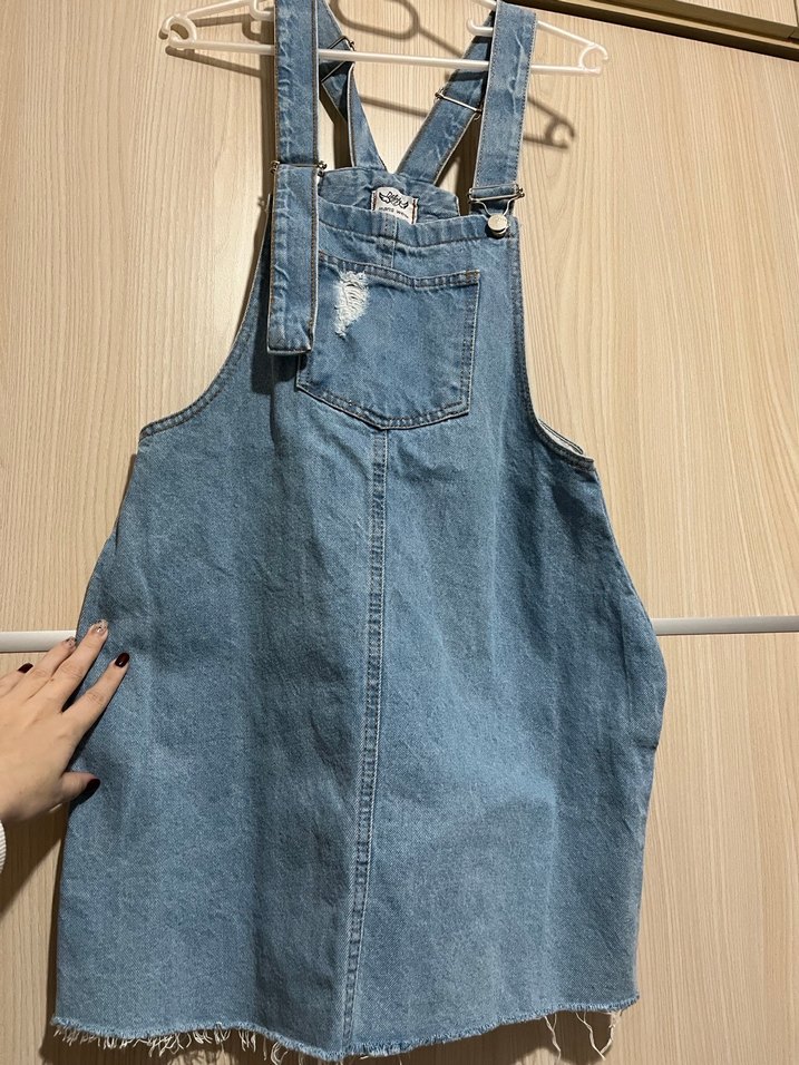 Bol kesim, mavi kot midi tulum. Ayarlanabilir tokalı askılar ve ön cep bulunur. Günlük kullanıma uygundur.