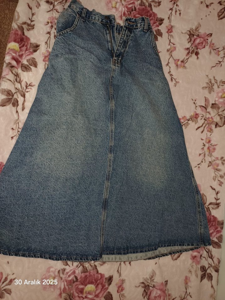 Kadınlar için uzun kot etek, bol kesim ve kemerli bel detayına sahip. Vintage bohem tarzını yansıtan sade mavi kumaşı günlük kullanıma uygundur.