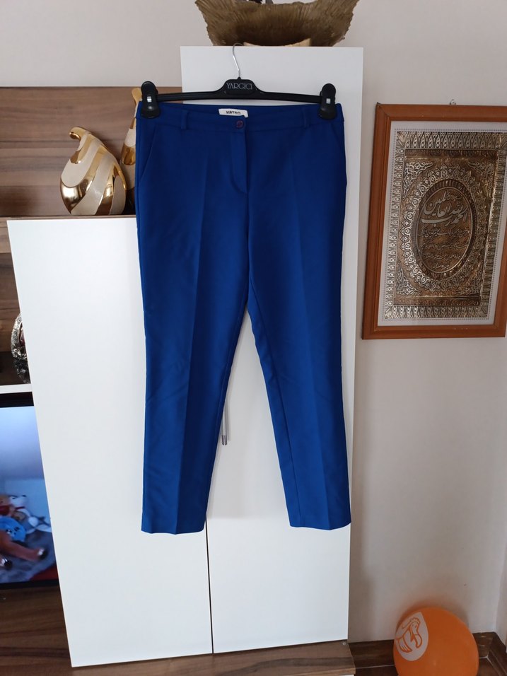 Kadınlar için kemerli, parlak mavi kumaştan, normal boy midi uzunluğunda, desen içermeyen, ofis için uygun kumaş pantolon.