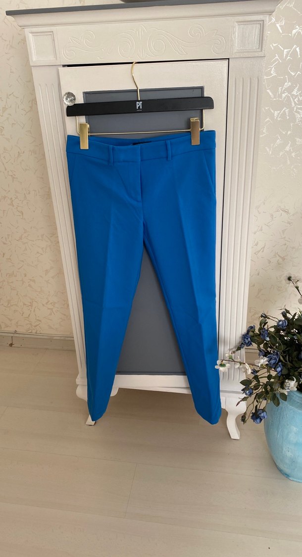 Kadınlar için kemerli, parlak mavi kumaş pantolon. Normal ve midi boyda, düz ve desen içermeyen tasarımla iş ve günlük kullanıma uygun.