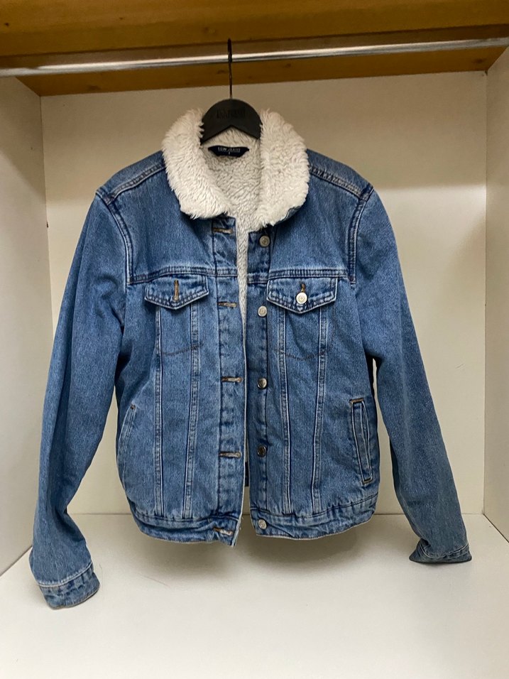 Mavi denimden üretilmiş, kürklü yakalı, uzun kollu ve bol kesim ceket. Notlu yaka ve normal boyda, günlük rahat sokak stili için uygundur.