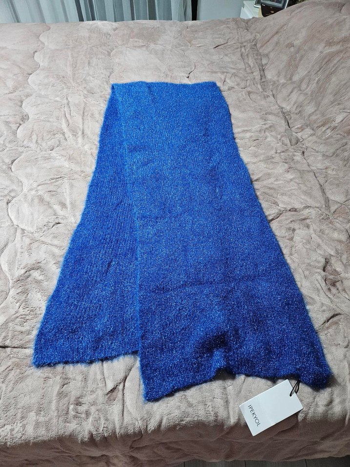 Kadınlar için yumuşak ve sıcak kumaştan yapılmış mavi renkli, kürklü detaylı atkı. Rahat ve çağdaş bir görünüme sahiptir.