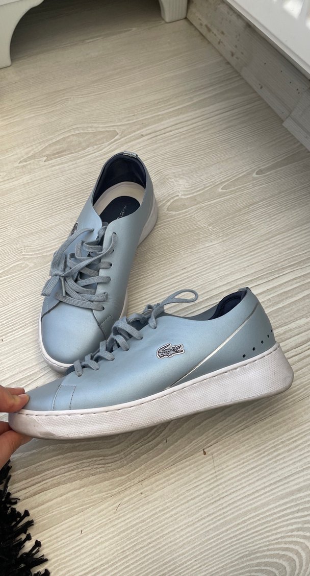 Pastel mavi renkte, bağcıklı ve düz tabanlı kadın spor ayakkabısı. Günlük kullanım için uygun, desensiz ve kauçuk malzemeden üretilmiştir. ♀️