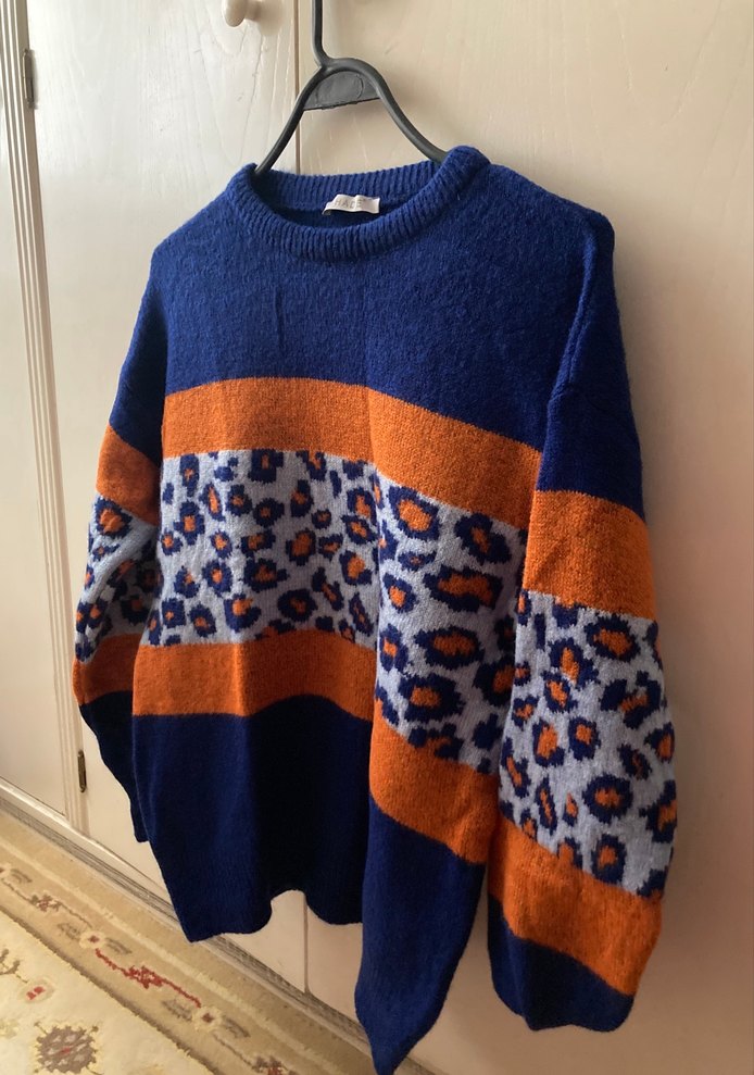 Kadınlar için uzun kollu, yuvarlak yakalı, bol kesim, mavi zeminli, turuncu çizgili ve leopar desenli triko kazak. Günlük kullanıma uygun rahat bir tasarım. shade marka