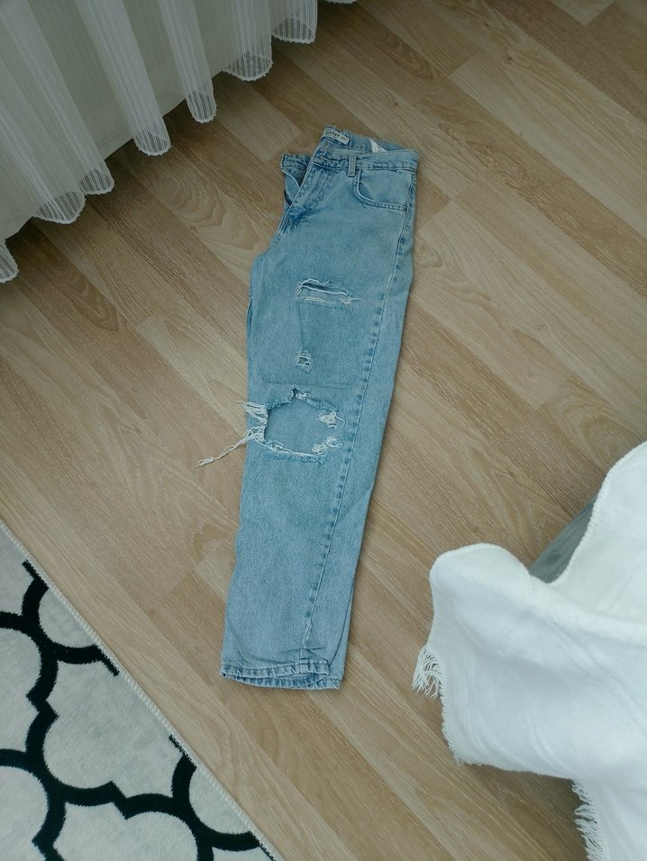 Kadınlar için pastel mavi renkte, loose fit ve midi boyda normal uzunlukta denim jean. Sokak stili ve günlük kullanım için uygun, tokalı ve yırtık detaylara sahip.