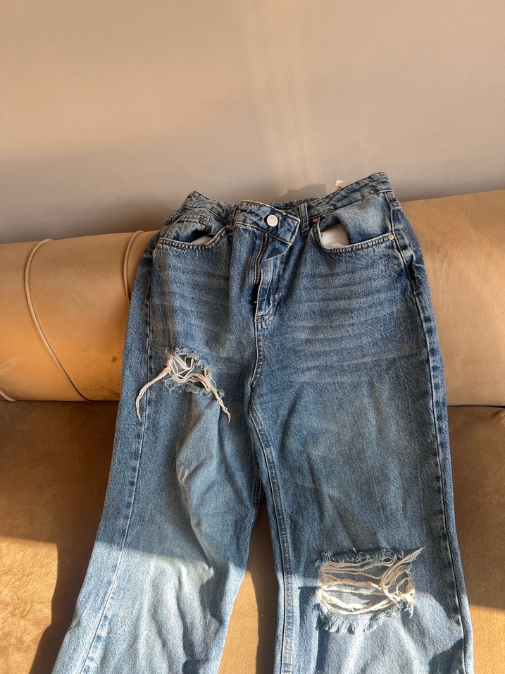 Mavi denimden, loose fit kesime sahip, midi boy ve tokalı detaylı kadın pantolon. Günlük kullanım için sokak stili, yırtık detaylı.