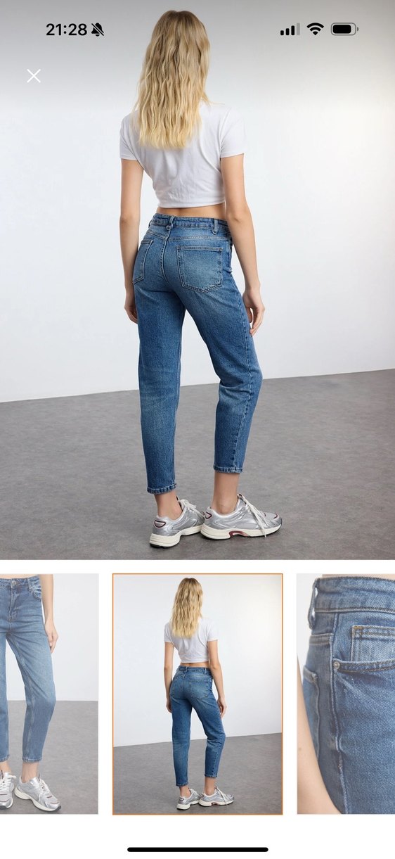 Mavi denim kumaştan, rahat loose fit ve normal midi boyda kadın jean. Günlük sokak stiline uygun, sade ve şık tasarım.