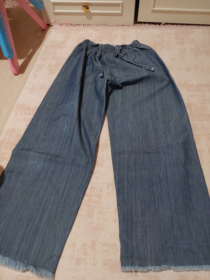 Beli kemerli, uçları püsküllü, mavi renkli, loose fit midi kot pantolon. Rahat ve günlük kullanım için uygundur.