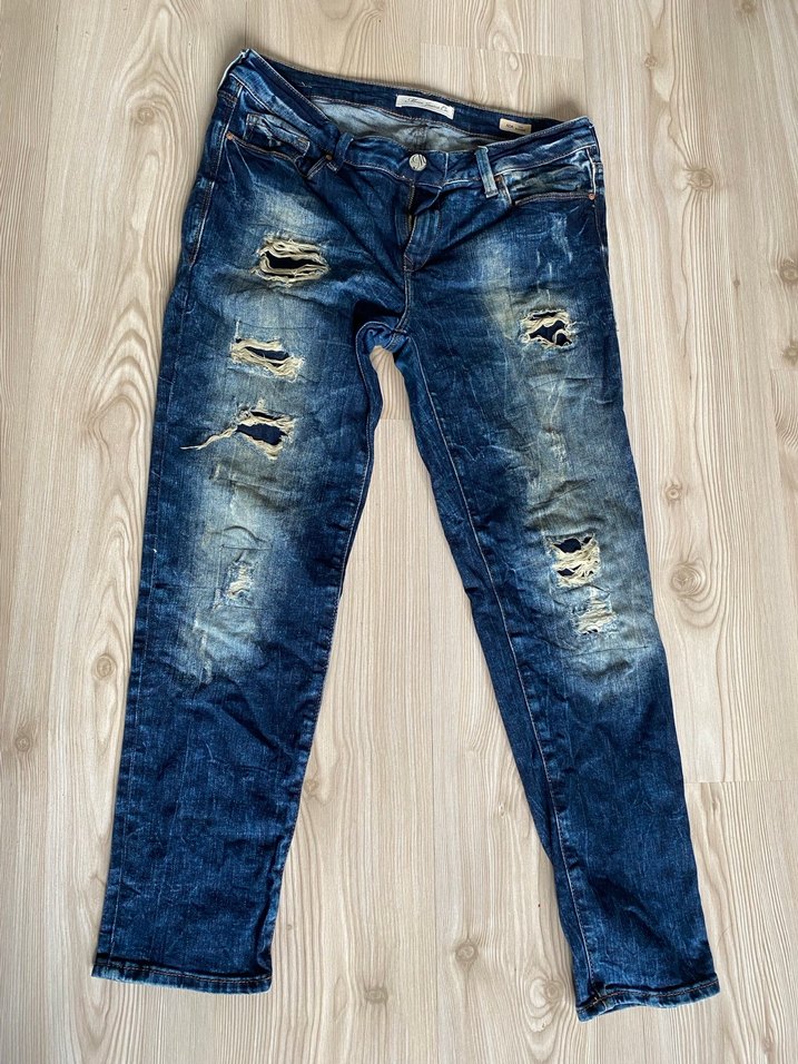 Mavi, loose fit kesim, kemerli ve yırtık detaylı kot pantolon. Parlak görünümlü midi boy, günlük sokak modasına uygun. Bel ölçüsü 42 cm’dir paça boyu ise 89 cm’dir