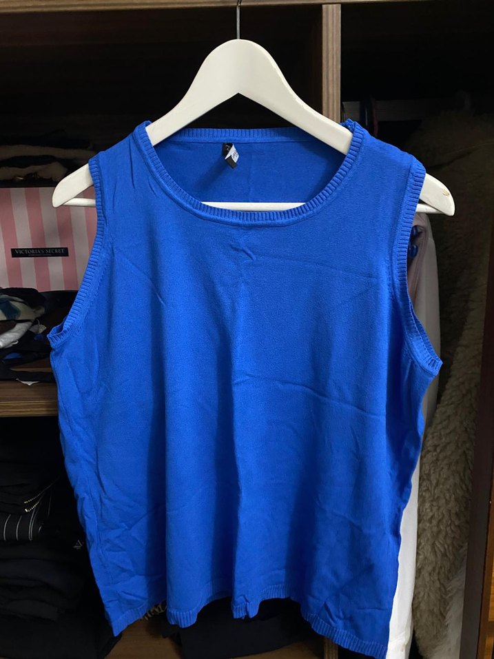 Kadınlar için kolsuz, yuvarlak yakalı, yapılmış salaş kesim mavi Günlük kullanım için rahat ve şık bir tercih.