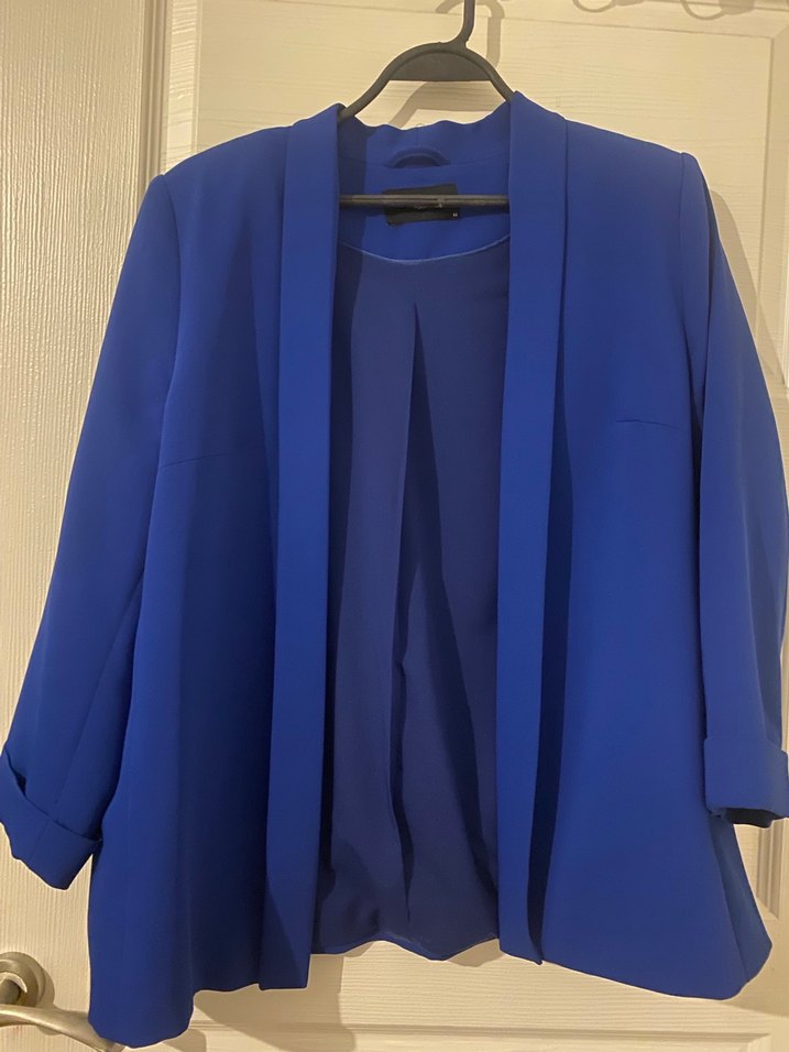 Kadınlar için koyu mavi, yakası kesimli, uzun kollu, normal kesim ve midi uzunlukta, ipeksi kumaştan drapeli blazer ceket. Ofis için uygundur.