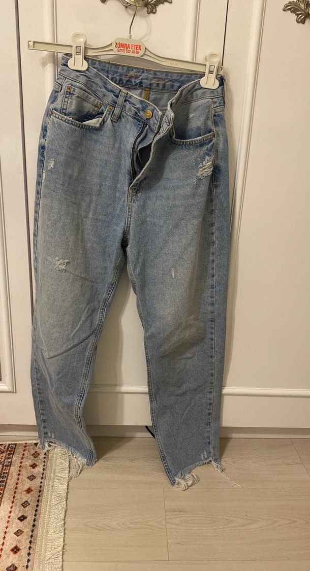 Denim kumaştan, bol kesim ve midi boyda, yırtık ve yıpranmış detaylarla gri-mavi tonlarında kadın kot pantolon. Üründe leke yoktur temiz üründür yüksel beldır resimde bütün detaylı şekilde çekilmiştir 34/36 beden arası 50 kg ya kadar giyilir
