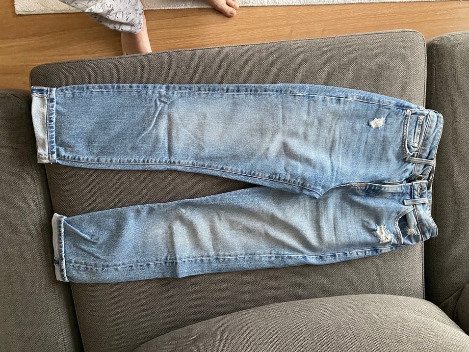 Kadınlar için denim malzemeden yapılmış, mom kesim ve midi boyda kot pantolon. Günlük rahat kullanım için sade mavi renkte.