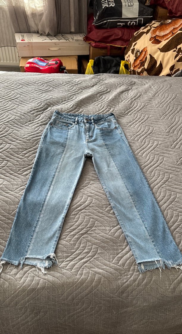 Kadınlar için normal kesim ve midi boyda, mavi tie-dye desenli denim kot pantolon. günlük kullanıma uygun rahat tarzı vardır. Zara mı bilmiyorum, etiketini sökmüşüz