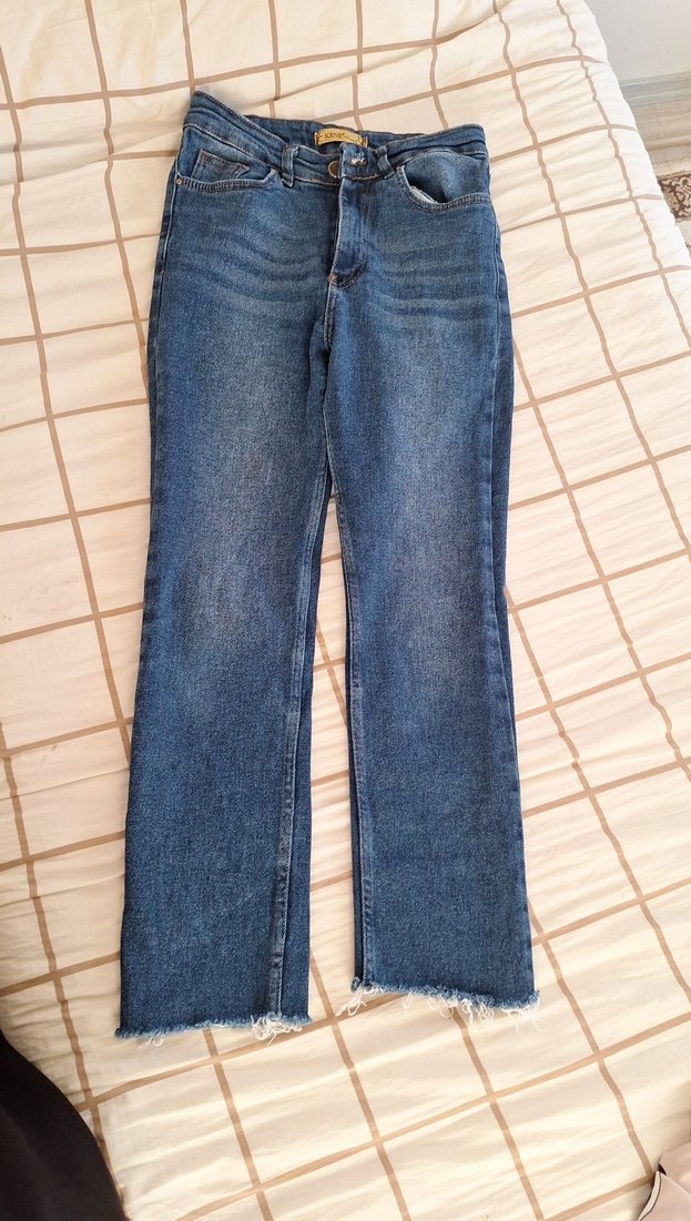 Mavi midi boy, normal kesim denim pantolon, paça ucu hafif yırtık, günlük kullanıma uygun rahat ve şık tarz sunar.