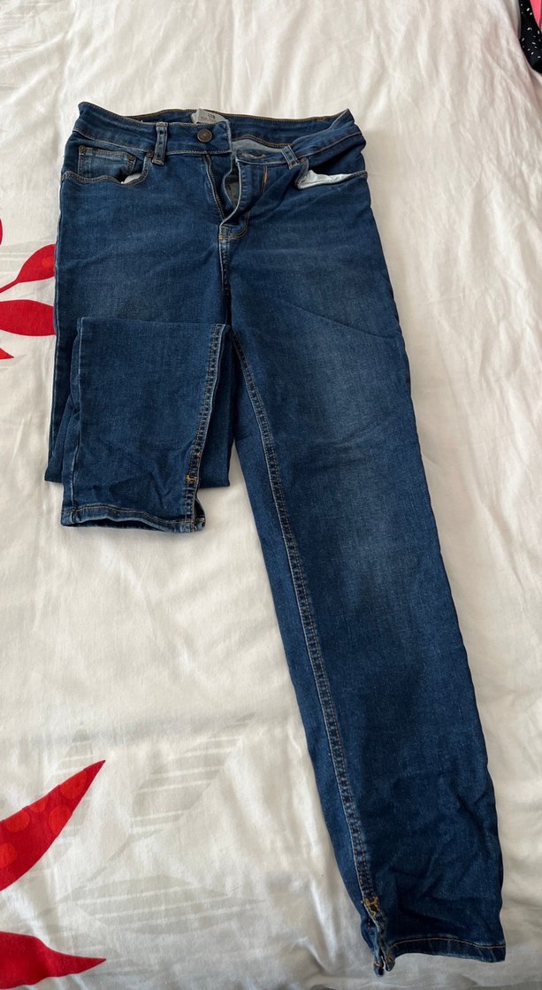Mavi denim kumaştan, regular fit ve midi boy kadın kot pantolon. Tokalı detayıyla günlük rahat kullanıma uygun.