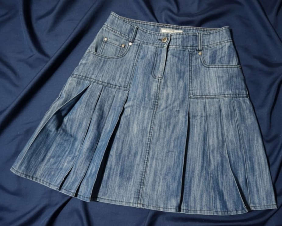 Mavi renkte, pile detaylı, normal midi boyda, bol kesim kadın kot etek, gündelik ve sokak stiline uygun. L-XL için uygun.