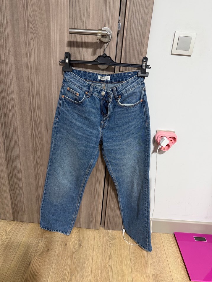 Kadınlar için mavi midi boy, rahat kesim kot pantolon. Kemer tokası detayı ve pastel tonuyla günlük sokak stiline uygun.