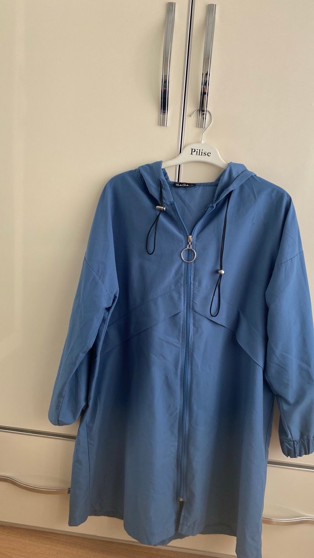 Mavi renkli kadın yağmurluğu, rahat kesim ve midi boydadır. Uzun kollu, çıtçıtlı ve parlak yüzeylidir. Günlük rahat kullanım için uygundur. ☔️