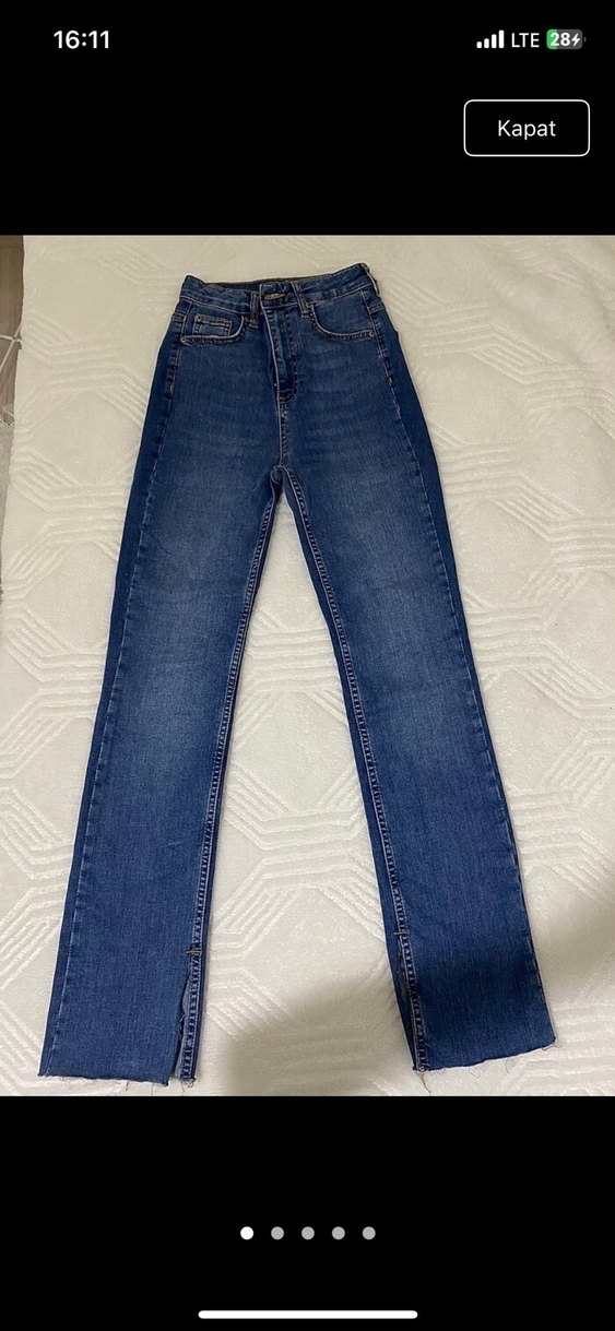 Kadınlar için mavi denim kot pantolon, normal kesim ve midi boyda, paçalarda yırtmaç detaylıdır. Günlük kullanım ve sokak stiline uygundur.