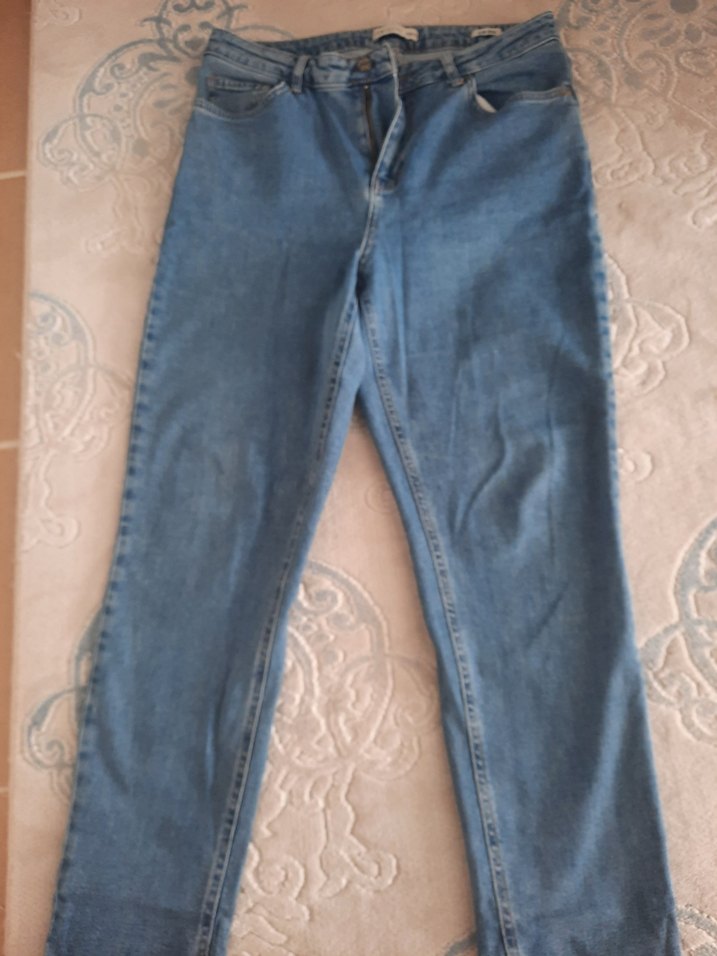 Düzenli kesim ve midi boyda mavi denim kot pantolon, günlük kullanım için rahat ve şık bir tarz sunar. Sokak modasına uygundur.