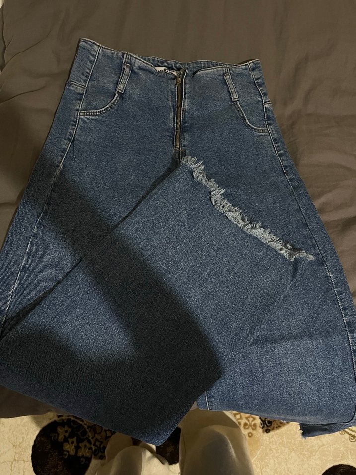 Kadınlar için mavi midi uzunlukta, düzenli kesim ve fermuarlı ön kapamalı jean etek. Ön kısmında yırtık detay bulunur, günlük kullanım için uygundur.