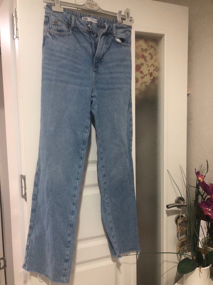 Kadınlar için mavi denim pantolon, normal midi boyda ve regular kesimde. Tokalı detay ve gündelik sokak stili ile günlük kullanım için uygundur.